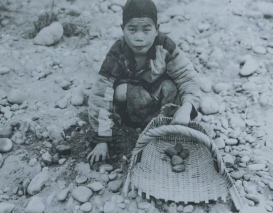 ▲ 图中少年正在捡拾用于修筑机场的石头(丁平摄于建川博物馆)