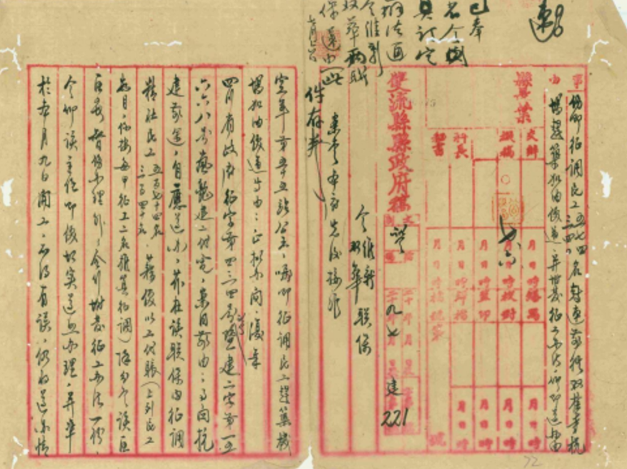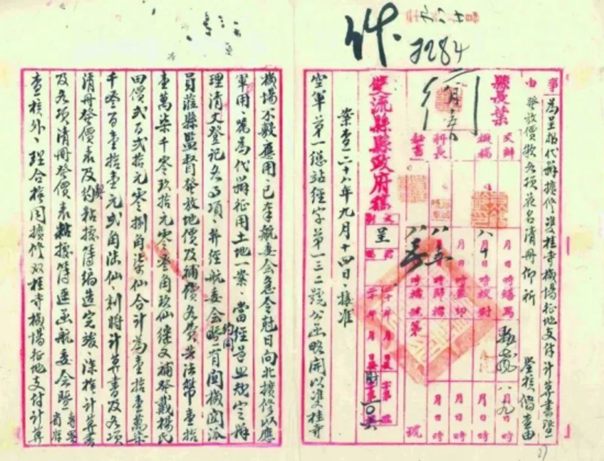 ▲ 图为《双流县县政府仰即征调民工五七四三四名转速前往双桂寺机场赶筑加油便道并附发征工办法由训令》(双流区档案馆 供图)