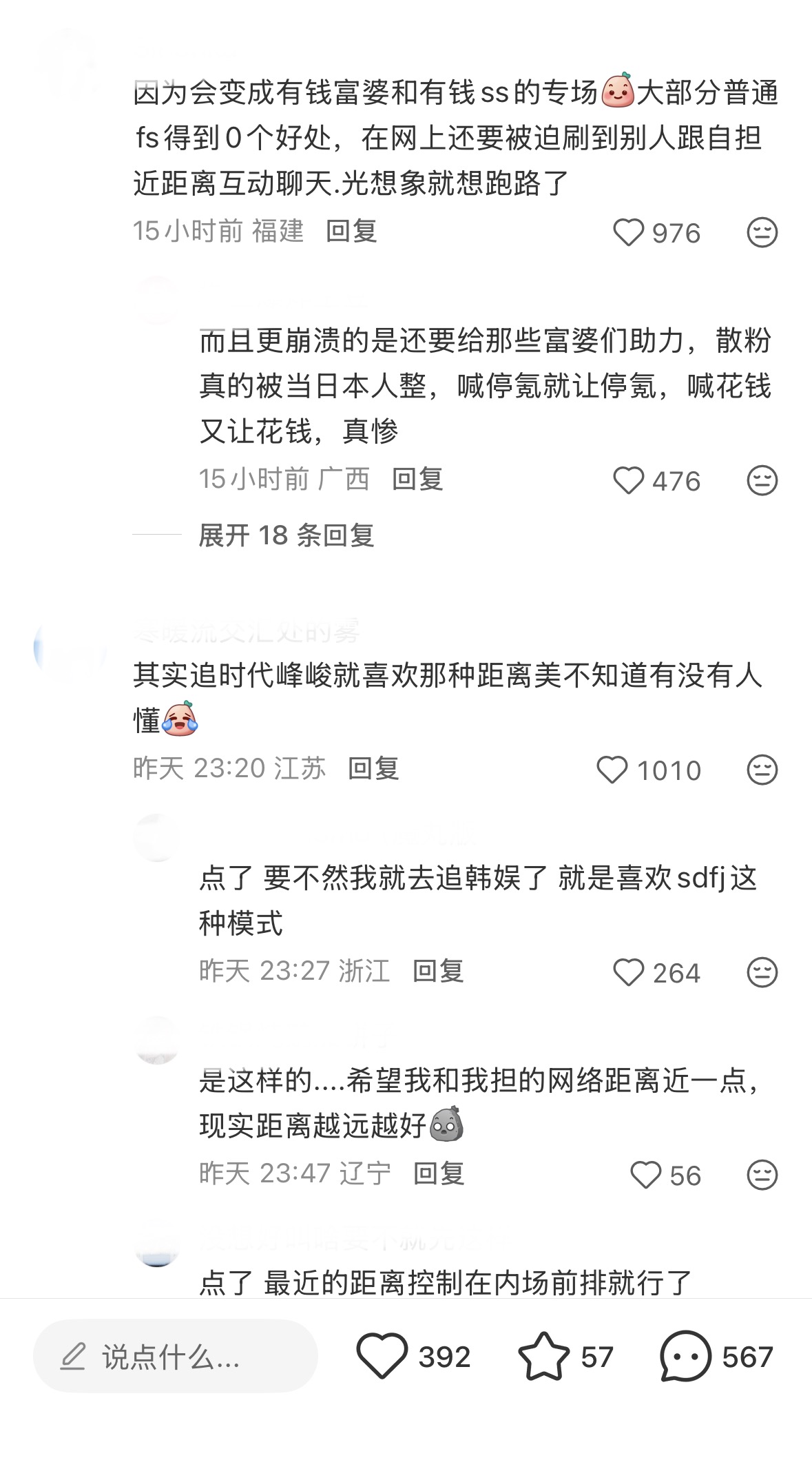从更深层次看,粉丝们的质疑也是对追星本质的一种追问。就像他们提到的,追星享受的就是远距离的模式,而不是非要追逐线下的近距离接触。正如粉丝评论道:“大家追星难道不是在偶像身上汲取到快乐与前进的动力,获得一份简单而宝贵的情绪价值?”“我不想把原本很快乐的事,变成因为我不够有钱所以无法见面的焦虑。”粉丝们所警惕和捍卫的,正是那份不让追星变为精神内耗的最初的美好。