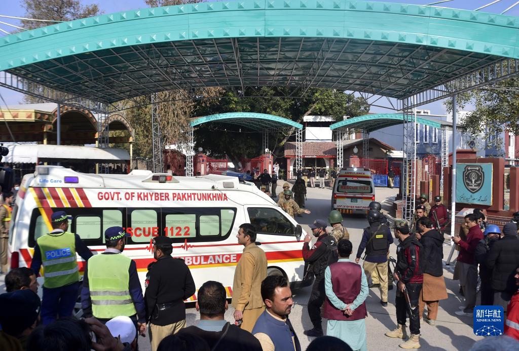 1月30日,在巴基斯坦西北部开伯尔-普什图省首府白沙瓦市,救护车抵达爆炸袭击事件现场。