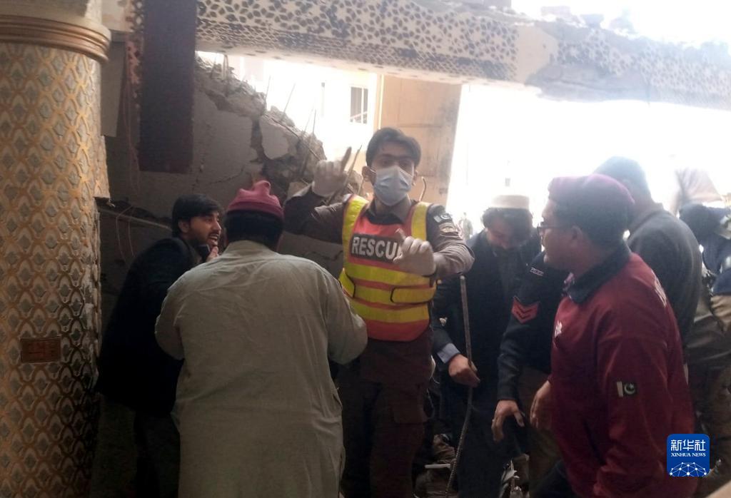1月30日,在巴基斯坦西北部开伯尔-普什图省首府白沙瓦市,人们在爆炸袭击事件现场搜救(手机拍摄)。