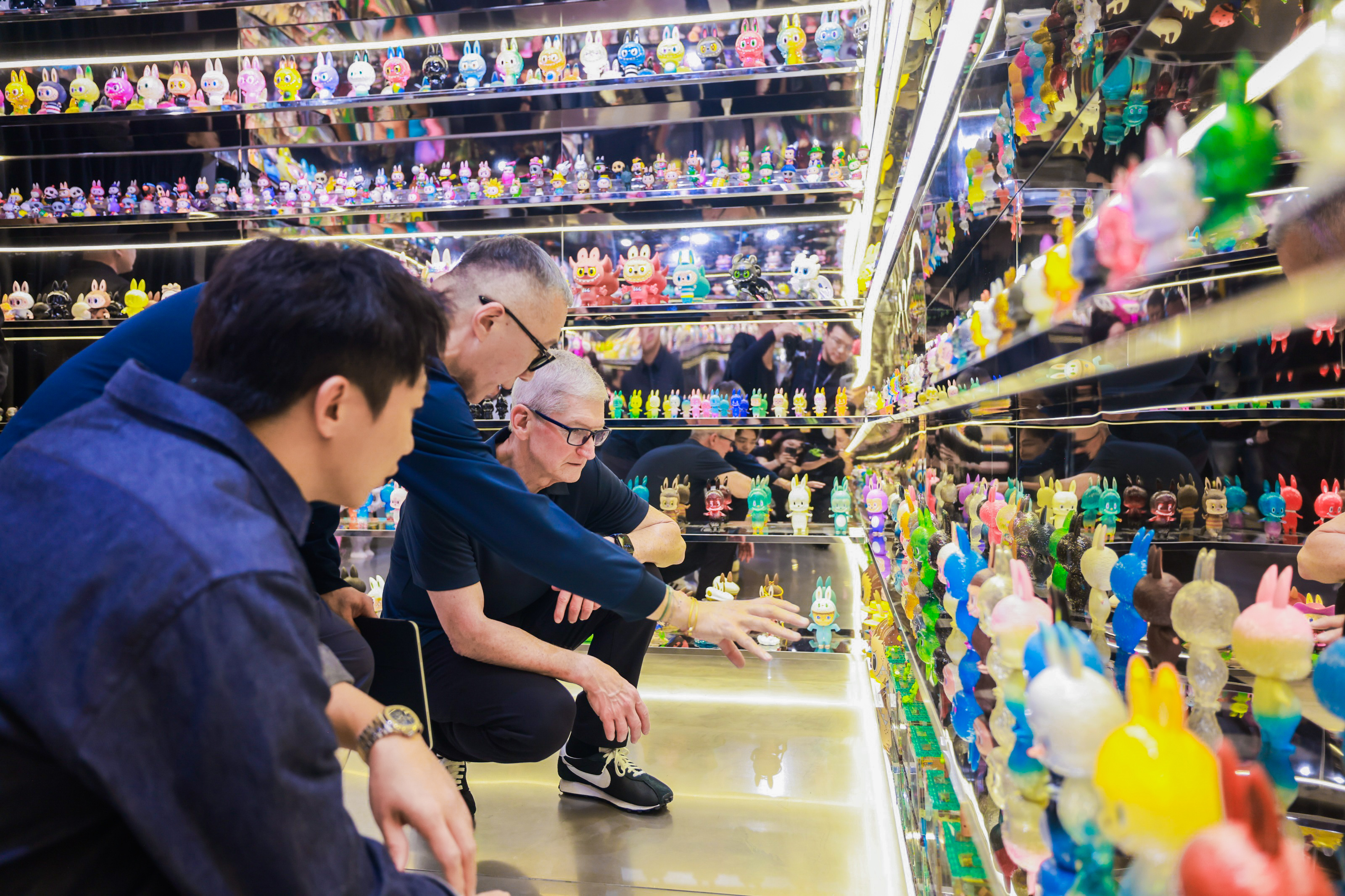 记者了解到,展览现场,泡泡玛特创始人王宁、LABUBU艺术家龙家升与库克进行了亲密互动,一起参观了LABUBU系列原创手稿和丰富多元的产品。龙家升现场向库克展示了如何在iPad Pro上绘制LABUBU,王宁还向库克赠送了惊喜礼物。