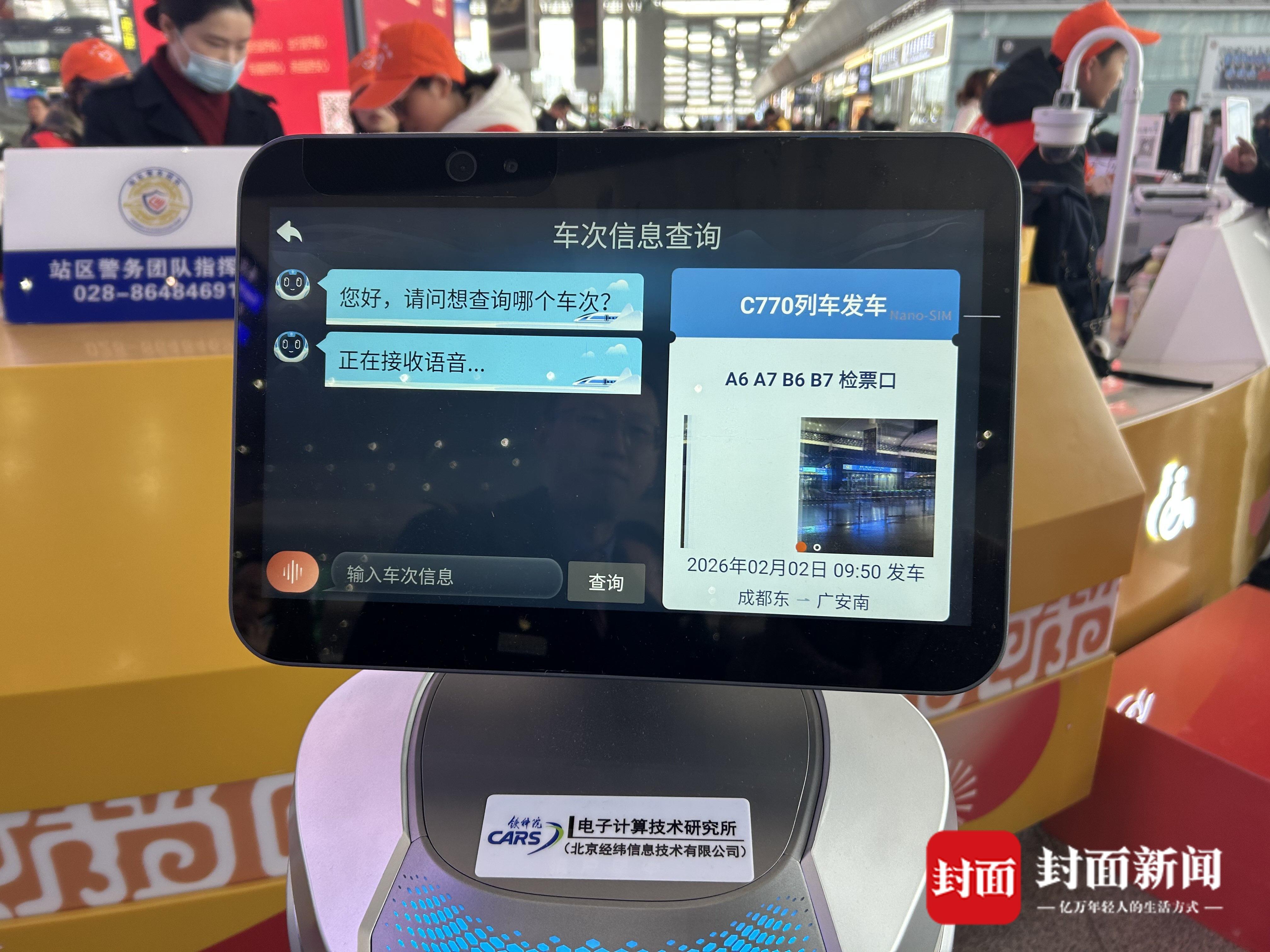 候车大厅游佳服务岗旁边,一台机器人吸引了不少旅客。安宇宵介绍,这是成都东站首次引入机器人,旅客可通过刷身份证、人脸识别或语音对话,快速查询车票、车次、检票等信息。