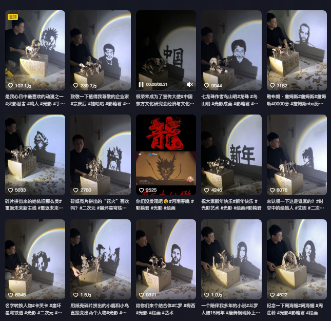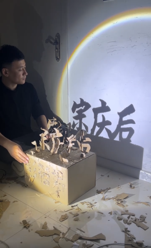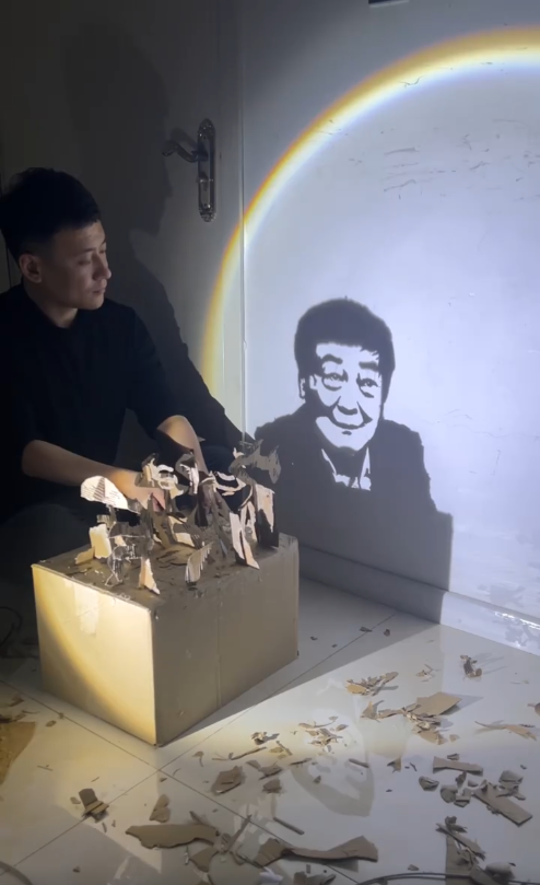 为了致敬已故民营企业家宗庆后,周滔用废纸箱制作了宗庆后的人像投影,废纸箱左右转动,一面呈现出“宗庆后”三个字,一面呈现出宗老人像,这个作品发布后获得了200多万的点赞。