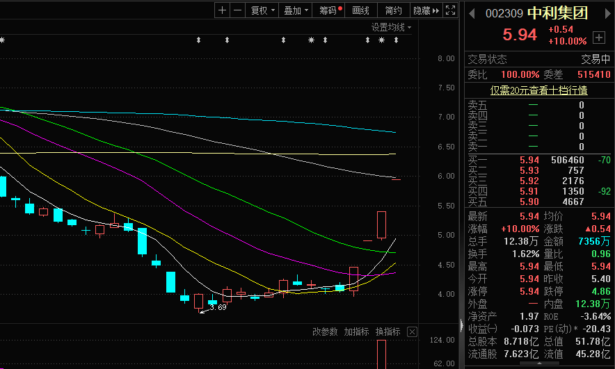 5月20日,截至发稿,中利集团涨停,封单超50万手,报5.94元每股。