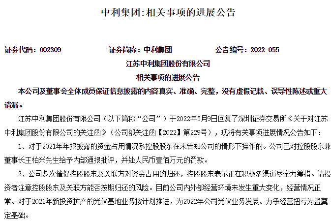 针对深交所关注函有关事项进展情况,中利集团公告称,对于2021年年报披露的资金占用情况系控股股东在未告知公司的情形下操作的。公司已对控股股东兼董事长王柏兴给予内部通报批评,并处100万元的罚款。