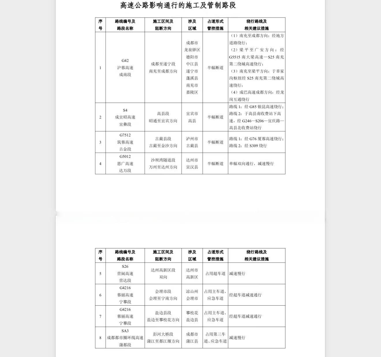 记者了解到,10月1日0时至10月8日24时,四川省境内高速公路禁止运输剧毒化学品、民用爆炸物品、烟花爆竹、放射性物品、危险废物、大件物品等车辆通行。9月30日10时至20时、10月1日10时至20时、10月7日10时至20时、10月8日10时至20时,四川省境内高速公路禁止除鲜活农产品运输车以外的三轴(含)以上货运车辆通行,相关车辆应当在禁止通行时段开始前,就近驶离高速公路。