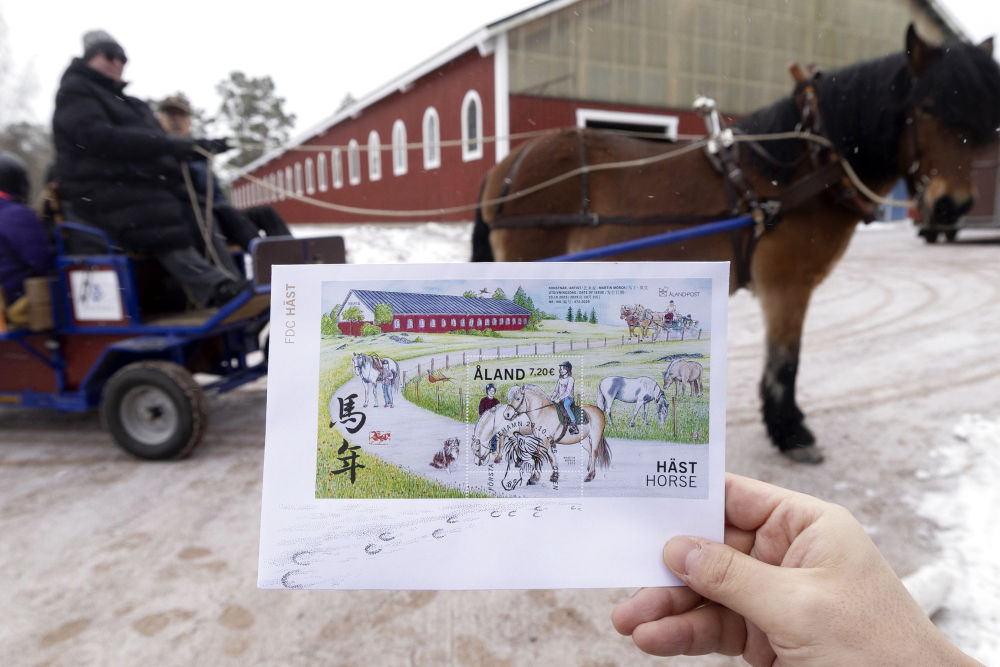这是1月21日在芬兰奥兰群岛自治区首府玛丽港市附近一处马场拍摄的马年生肖主题邮票。新华社发(马蒂·马蒂凯宁摄)