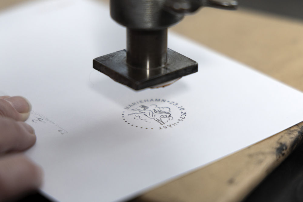 1月21日,在位于芬兰奥兰群岛自治区首府玛丽港市的奥兰群岛邮政署总部,工作人员为一张明信片盖上马年生肖主题印章。新华社发(马蒂·马蒂凯宁摄)
