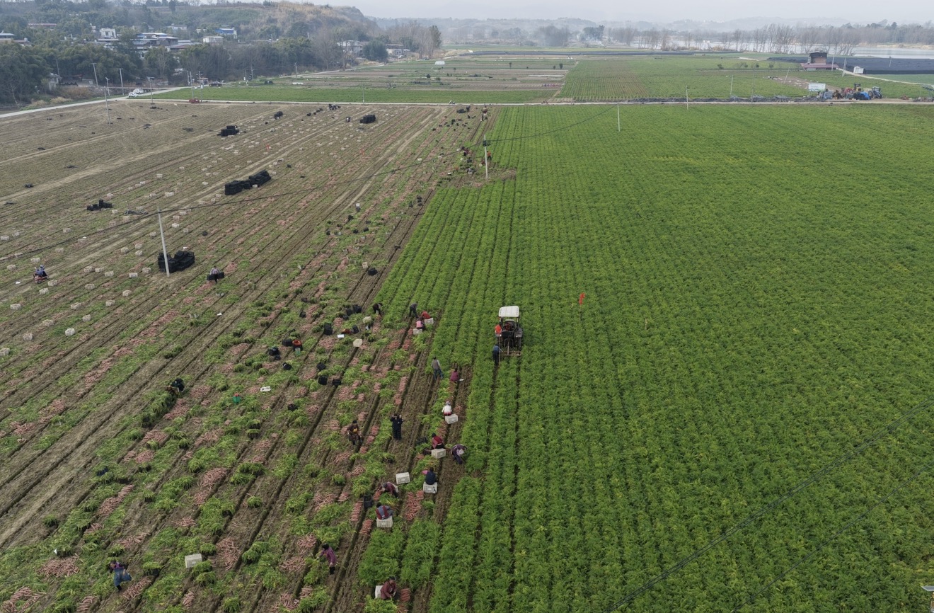 近日,成都东部新区养马街道田家坝社区640余亩萝卜种植基地里,一片丰收的热闹景象,翠绿的萝卜缨子在微风中翻涌成浪,胡萝卜、圆根萝卜迎来集中采收期,预计总产量突破640万斤。