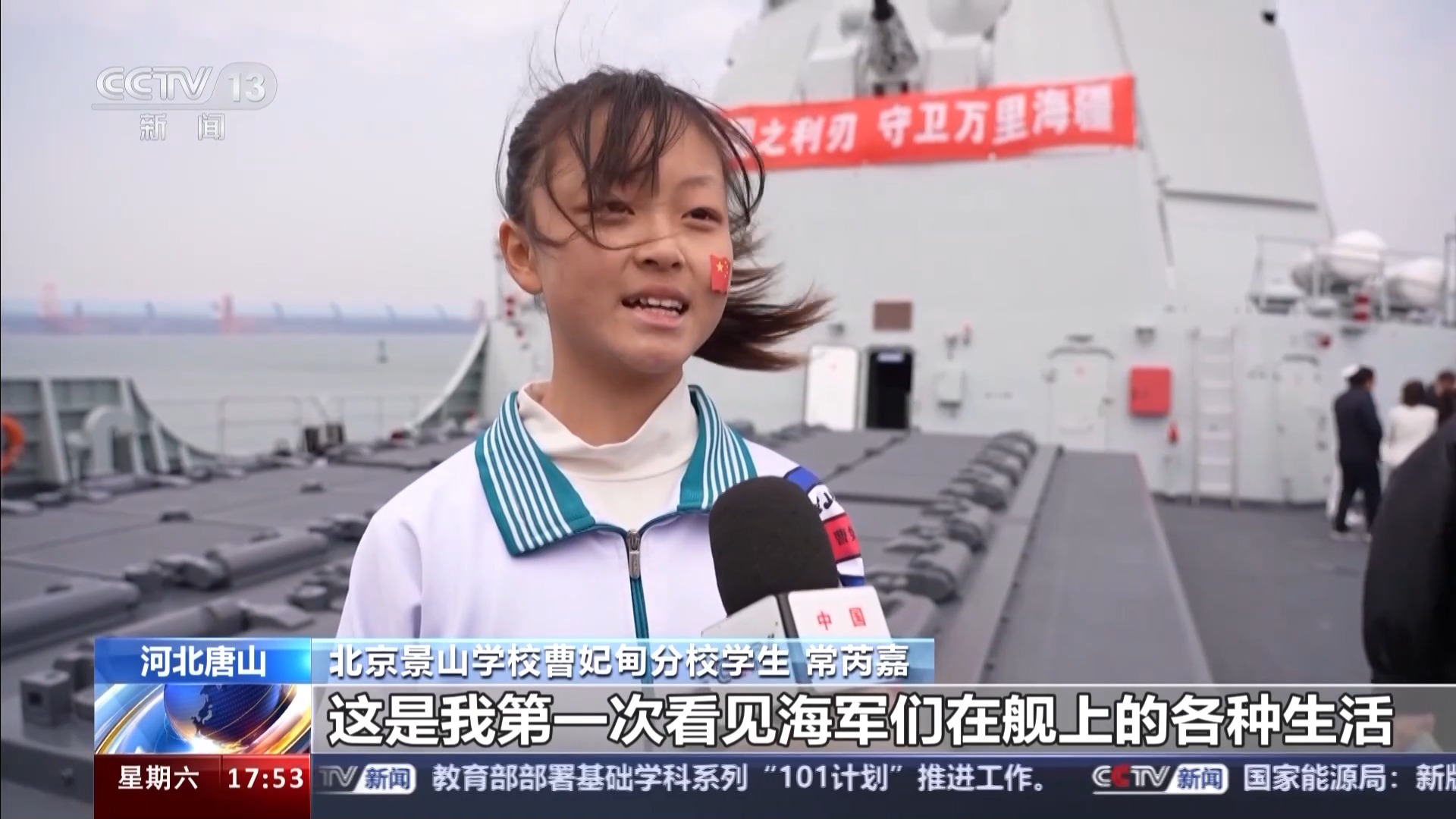 北京景山学校曹妃甸分校学生 常芮嘉:这是我第一次看见海军们在舰上的各种生活,第一次看见这么先进的武器,让我感到非常激动、非常好奇。因为我也是唐山人,“唐山舰”回家就有种亲人回来的感觉,让我感到特别温暖、特别骄傲。“唐山舰”欢迎回家!