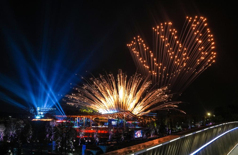 ↑8月17日拍摄的成都世运会闭幕式上的焰火表演。新华社记者 胥冰洁 摄