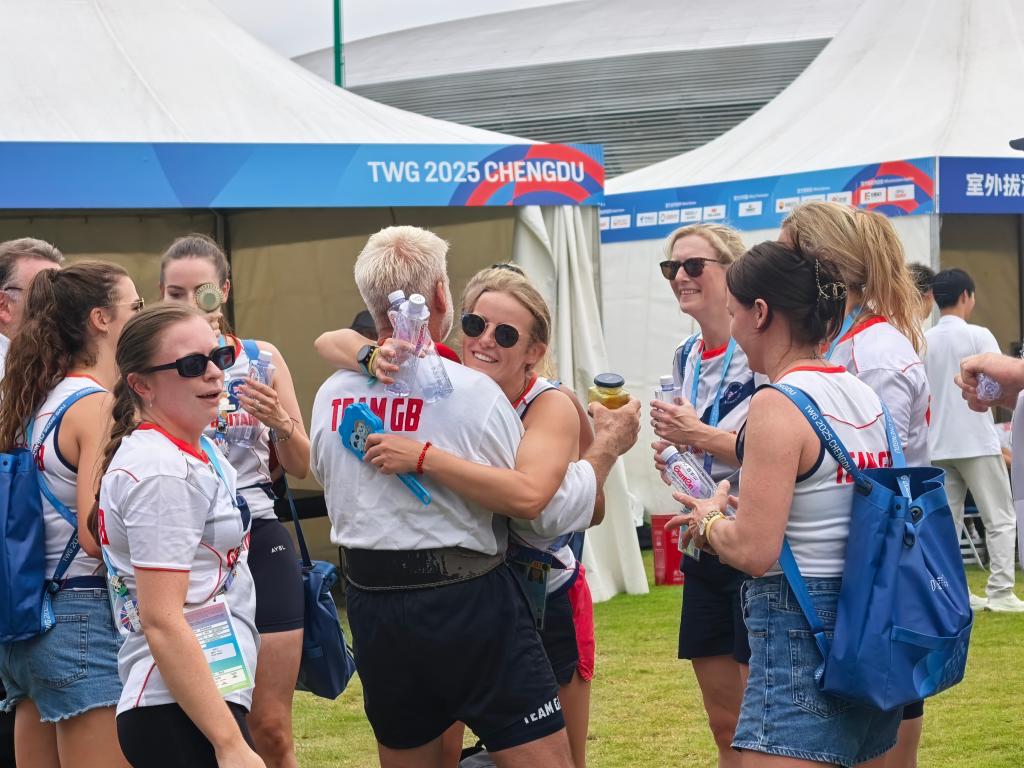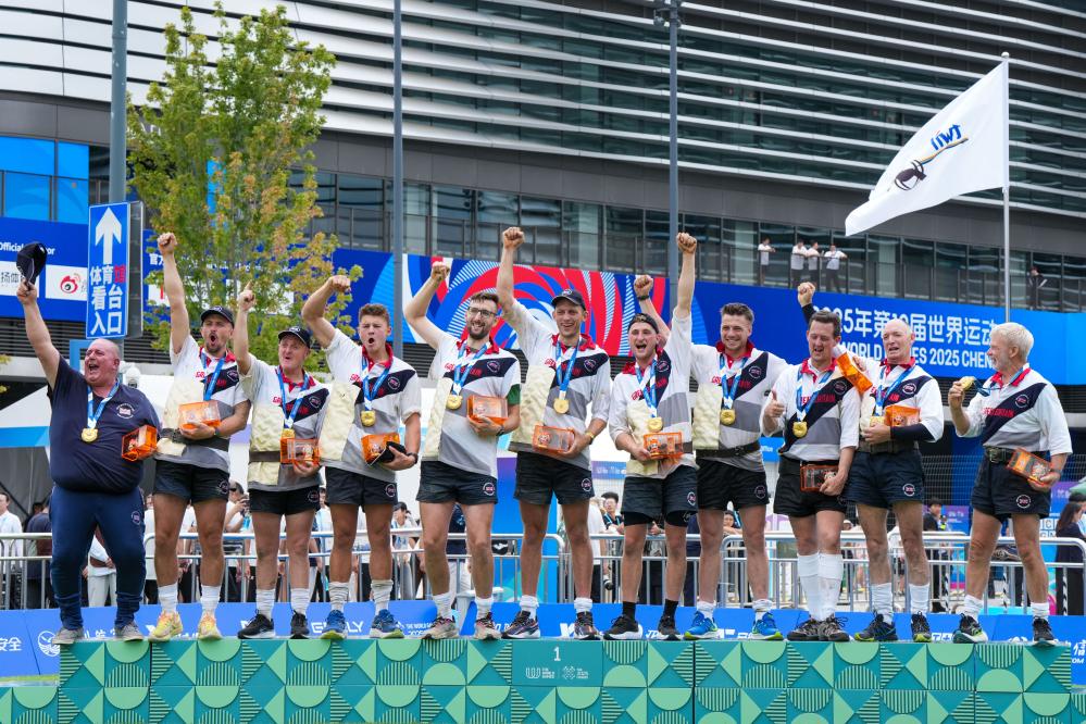 ↑8月9日,冠军英国队在室外拔河640公斤级颁奖仪式上。新华社记者 李博 摄