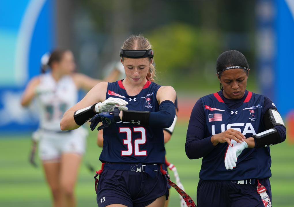 ↑8月17日,美国腰旗橄榄球选手瓦妮塔(右)与队友在比赛中对战术。新华社记者 江宏景 摄