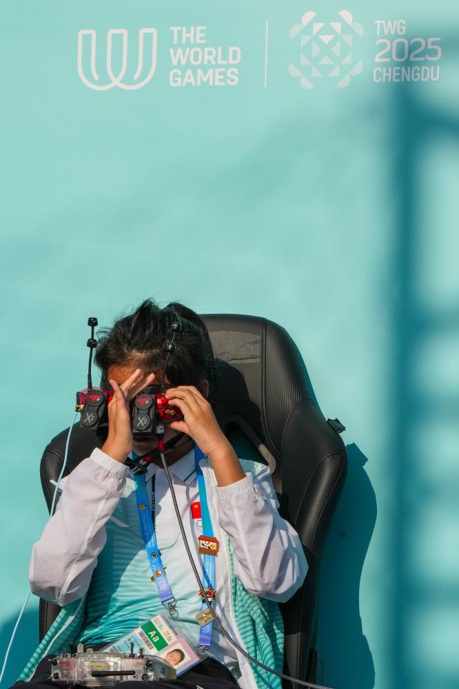 ↑8月15日,中国选手李甜星在无人机竞速比赛前准备。新华社记者 李博 摄