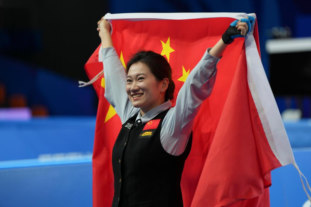↑中国选手韩雨获得成都世运会女子花式台球冠军。新华社记者 胥冰洁 摄
