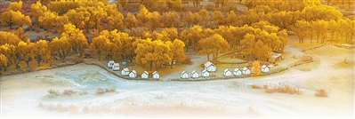 新疆于田县达里雅布依老村地处沙漠腹地,不通公路、没有通信信号和稳定供电。整村易地扶贫搬迁后,当地在老村附近发展沙漠探险等特种旅游,吸纳村民加入旅游合作社,拓宽增收渠道。图为老村附近的胡杨林带和新修的民宿。 新华社记者 陈 朔摄