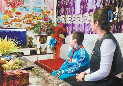 艾孜热提罕·木沙和儿子在新家一起看电视。 本报记者 尚嵘峥摄