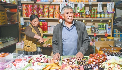 村民艾尼瓦尔·买提斯地克(右)和妻子一起在达里雅布依老村经营一家小商店,为到访的游客提供便利。 新华社记者胡虎虎摄