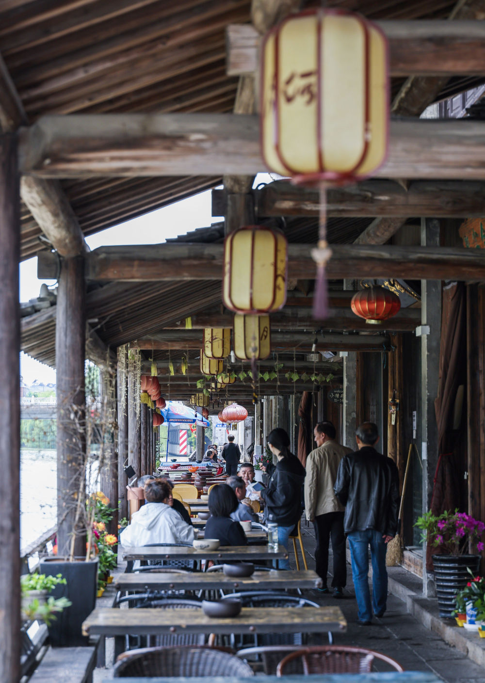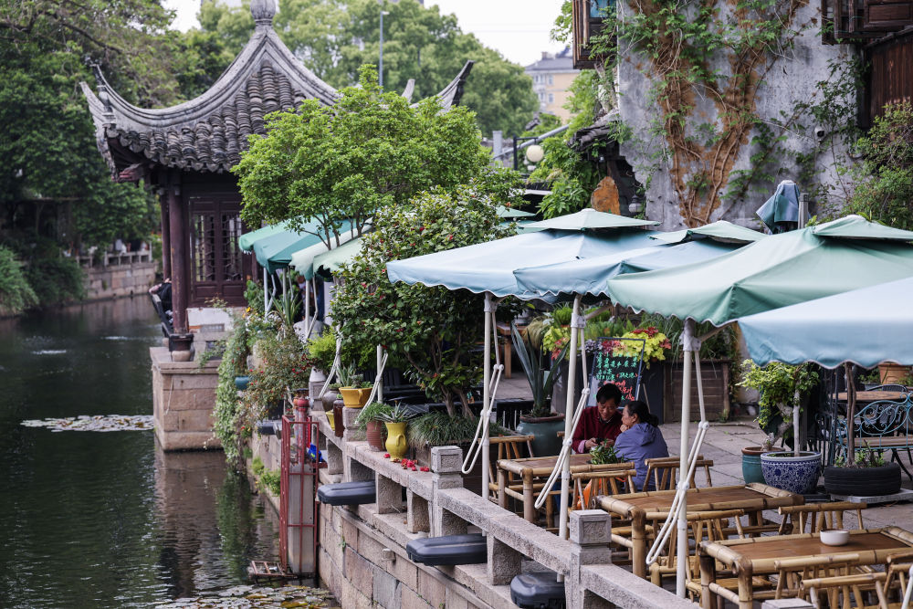 4月26日,游客在月河历史街区河边喝茶休息。新华社记者 徐昱 摄