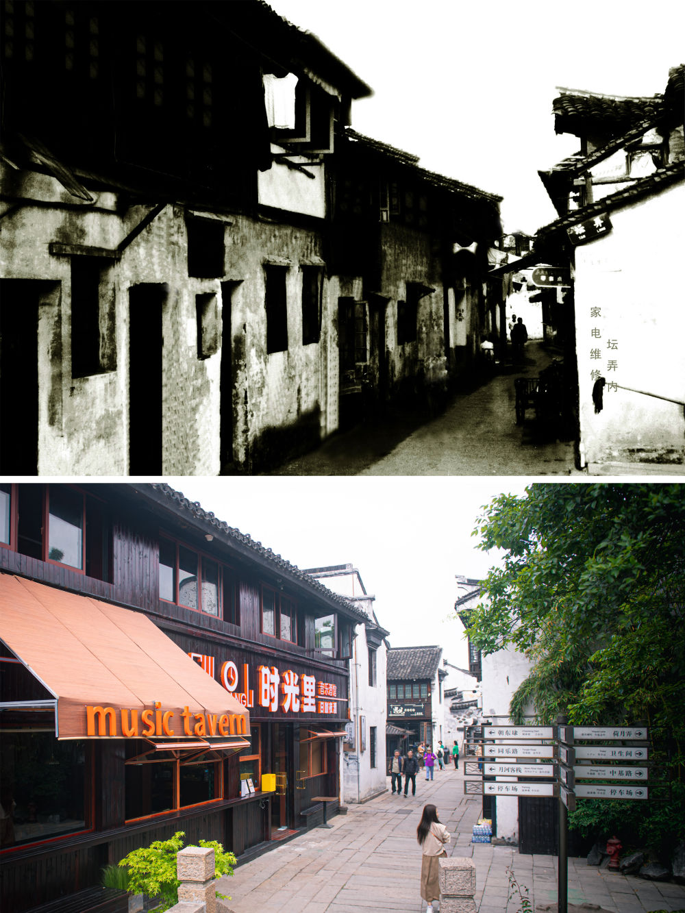 拼版照片:上图为1979年的嘉兴市月河历史街区坛弄(资料照片,庞艺影摄);下图为4月26日拍摄的游客在嘉兴市月河历史街区坛弄游玩(新华社记者江汉摄)。