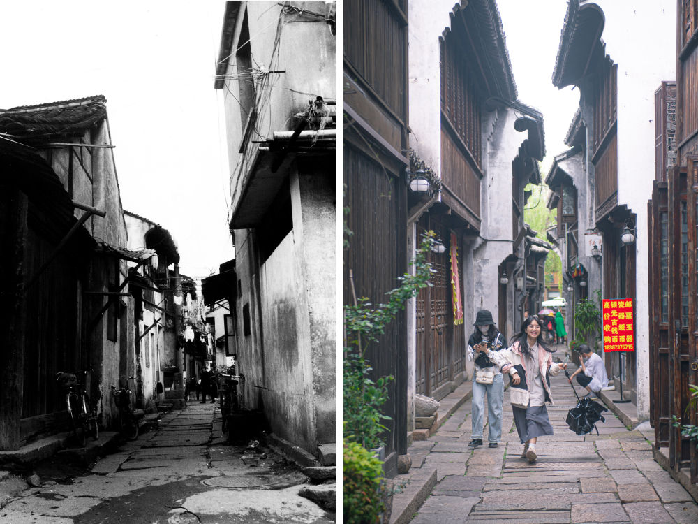 拼版照片:左图为1979年的嘉兴市月河历史街区蒲鞋弄(资料照片,庞艺影摄);右图为4月26日,游客在嘉兴市月河历史街区蒲鞋弄游玩(新华社记者 江汉 摄)。