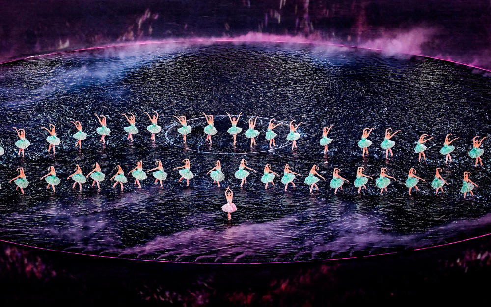 郎昆介绍,开幕式在空间叙事、艺术表达等方面都体现了三地文化交融。主舞台直观呈现“同心圆”造型,环形舞台周边是广阔的水面,运用前沿的“虚实结合”技术,让珠江、维多利亚港、伶仃洋的水波在场地中交汇奔流。这不仅是地理水系的相连,更是三地同源共流的文化血脉与手足亲情的象征。