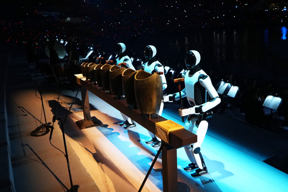 陈维亚介绍,这个创意来源于中华优秀传统文化和岭南文化的结合,千年前的青铜句鑃,加入机器人表演后达到古今和鸣、时空交响、一鸣惊人的效果。