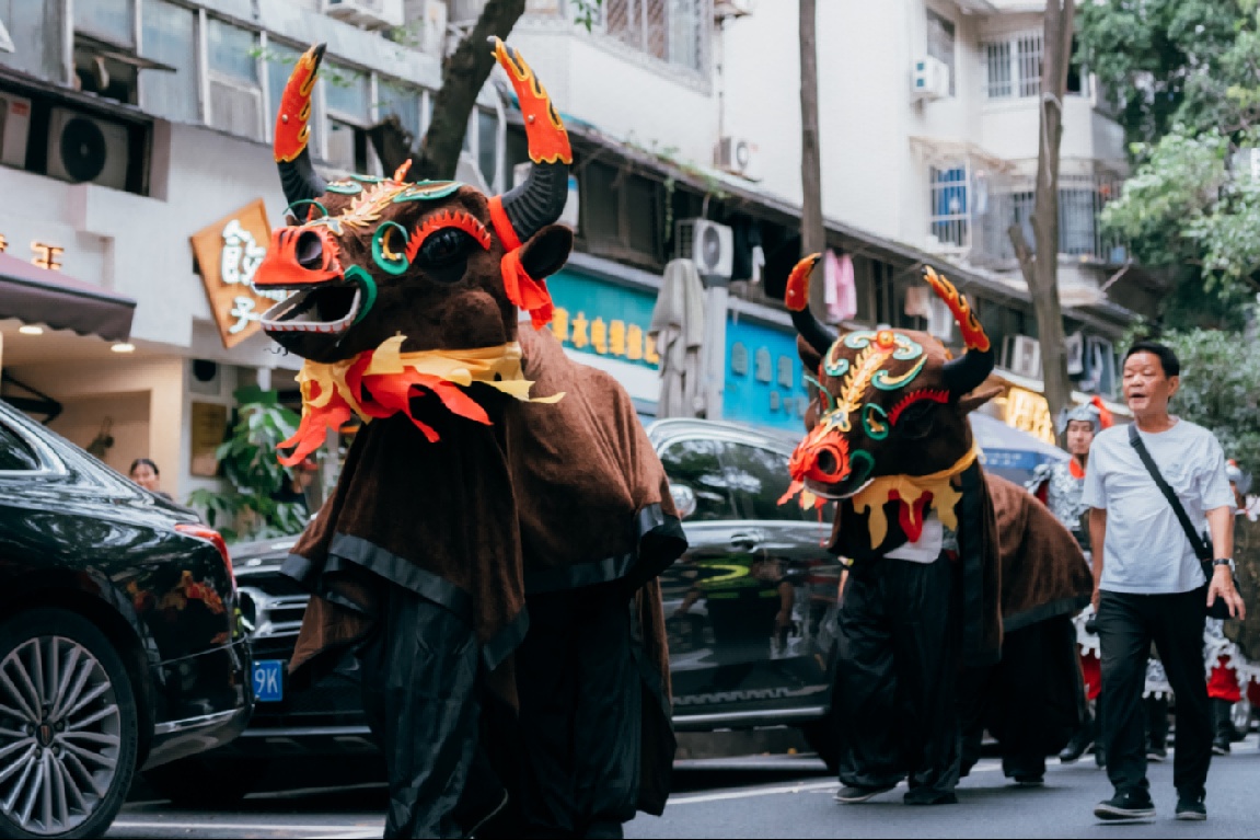 此次走进玉林,是火牛阵一次突破性的“出圈”尝试。表演者们褪去了古战场厚重的黄烟与烈焰,而是以更亲和、更生活化的姿态,融入城市肌理。在玉林的咖啡馆、小酒馆与创意店铺之间,这支由曾经的农民组成的队伍,从容地向世界展示着乡土文化的魅力。来自各地的游客,惊喜地用手机记录下这意想不到的文化瞬间,并与造型威猛又不失憨厚的“火牛”合影互动。文化的隔阂在欢声笑语中被消解,非遗以一种“活态”的方式,完成了从“被保护”到“主动传播”的跨越。