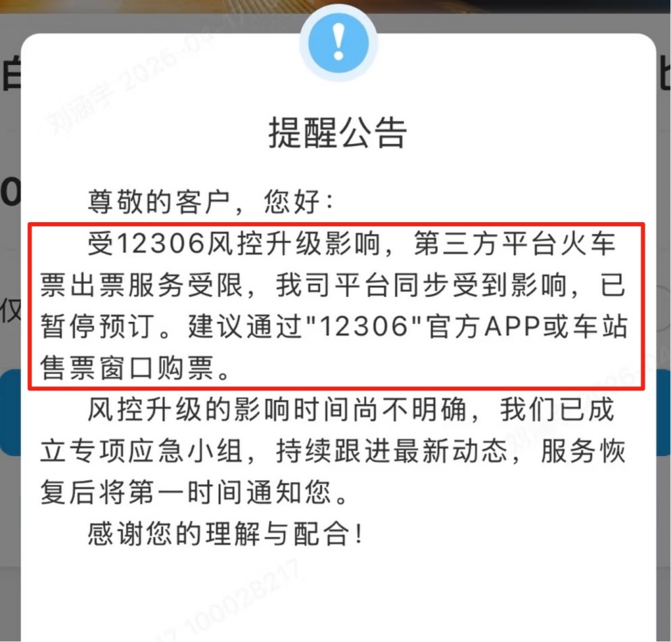 携程商旅一客户经理向九派财经记者发送一则《携程商旅火车票服务调整通知》称,“受相关系统风控全面升级影响,自2026年4月16日(五一假期票务开售首日)起,第三方平台火车票线上出票服务中断,我司平台线上自动出票功能同步受到影响,暂时无法稳定提供服务。自2026年4月17日12:00起,携程商旅APP将陆续关闭火车票预订入口。”