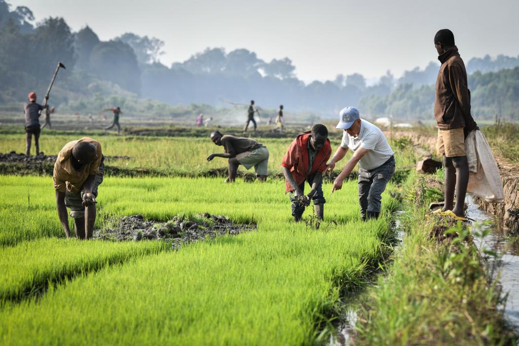 2024年8月14日,在卢旺达南方省胡耶区,水稻专家郑瑞金(右二)在稻田里指导当地稻农进行秧苗移栽。新华社记者 韩旭 摄