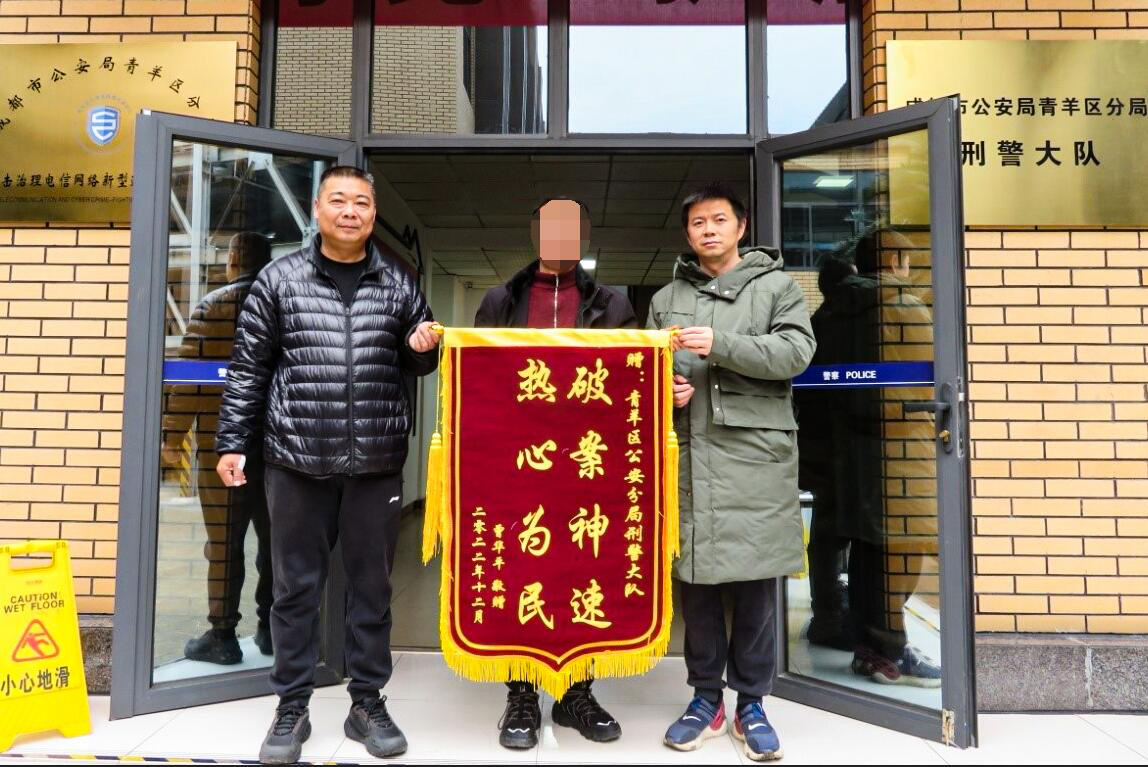 近日,800余万元失而复得的曾先生将“破案神速 热心为民”的锦旗送至青羊公安分局,对专案组民警表示感谢。