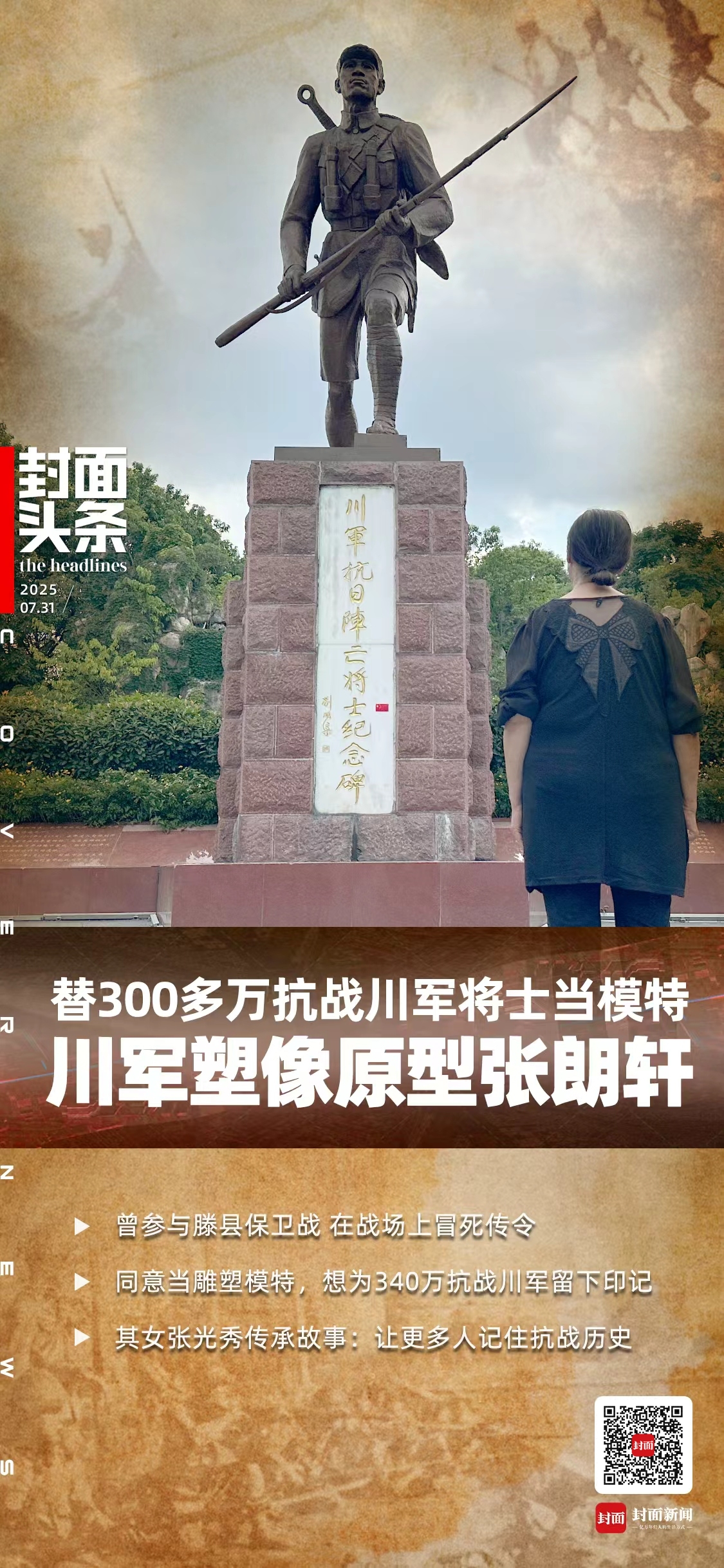 “每次经过都要停下来看看,就像看见了父亲,看见了昔日川军出川抗战时的样子。”7月23日,张光秀站在人民公园外,仰望塑像,眼含泪水,“塑像原型是我的父亲张朗轩,他曾在前线参加抗战,回来后,替300多万出川抗战将士当了雕塑的模特。”