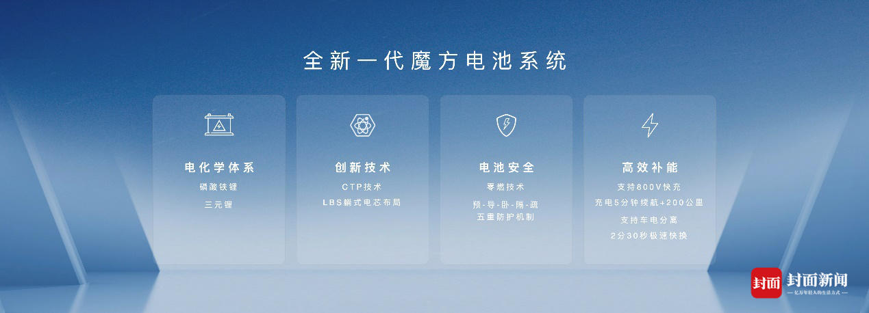 作为行业领先的动力储能解决方案,全新一代魔方电池系统支持磷酸铁锂、三元锂等多种电化学体系。其采用高效安全的CTP技术、创新的LBS躺式电芯布局,还应用零燃技术,通过五重防护机制,为用户构筑坚固的安全防线。全新一代魔方电池系统还兼容领先的补能技术,可支持800V快充,充电5分钟,续航可增加200公里,还支持最快仅需2分30秒的极速换电。