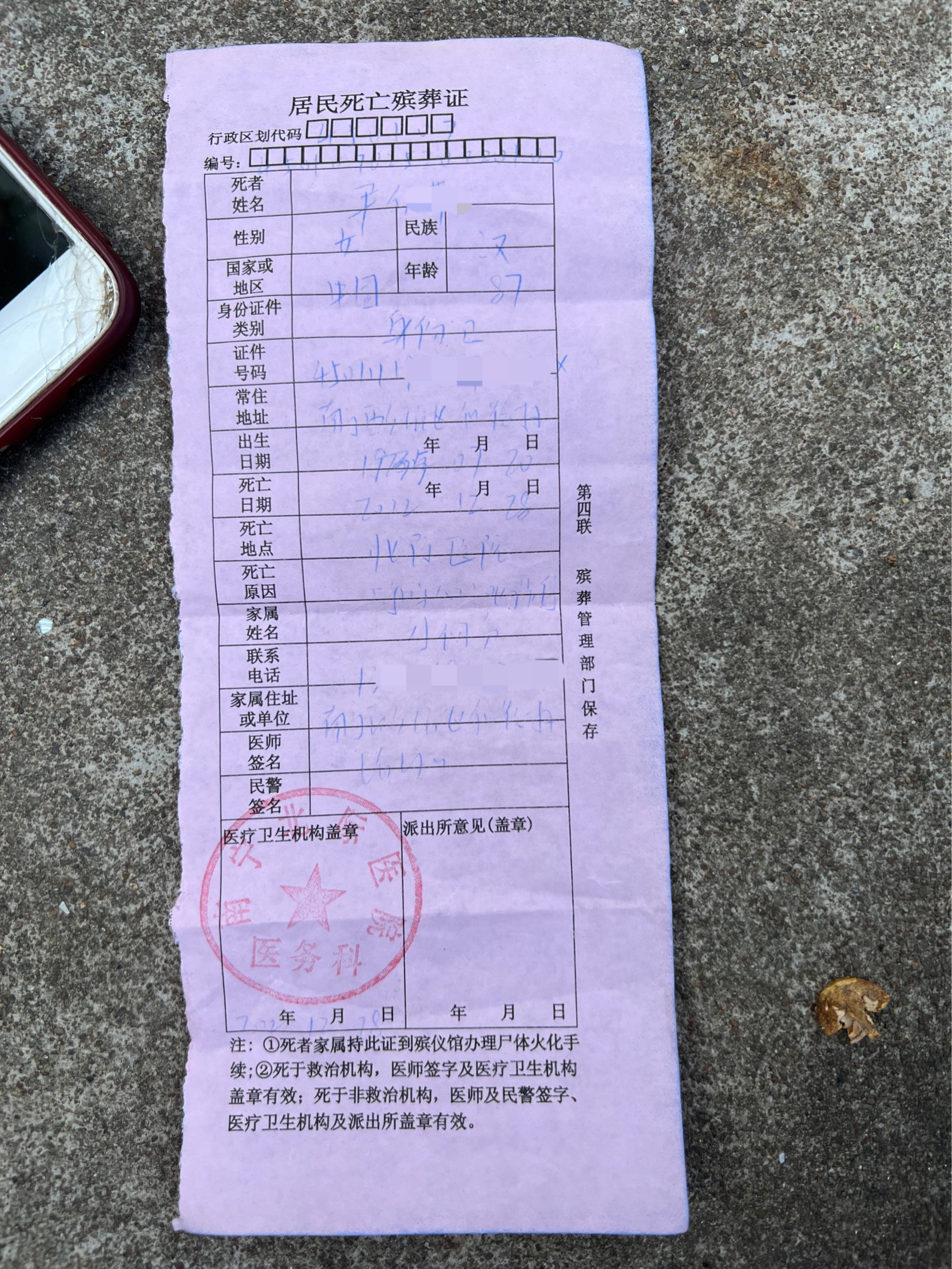 院方出具尹婆婆的殡葬证 图源受访者