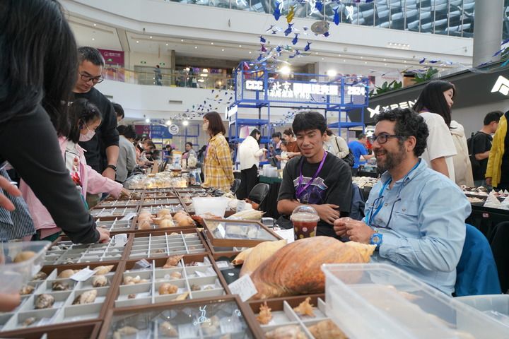 在北京市朝阳区一家商场举行的贝壳展上,摊主与顾客交流(2024年10月2日摄)。新华社记者 吴青昊 摄