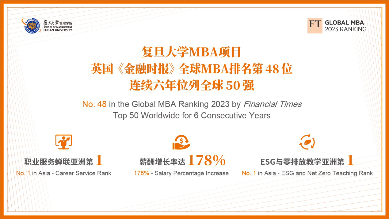 2023年2月13日,英国《金融时报》(FT)发布2023年全球MBA项目百强榜单,复旦MBA项目位列全球第48位,连续6年稳居全球前50强。其中,在“职业服务”子项上,复旦MBA蝉联亚洲第一;在“ESG与零排放教学”子项上,复旦MBA位列亚洲第一。