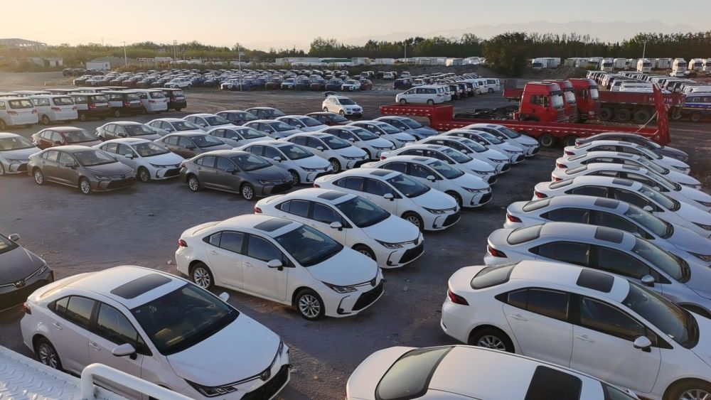 2023年9月,苏美达百余台二手新能源汽车整装待发,从南京发出,在新疆霍尔果斯口岸集港。(受访者供图)