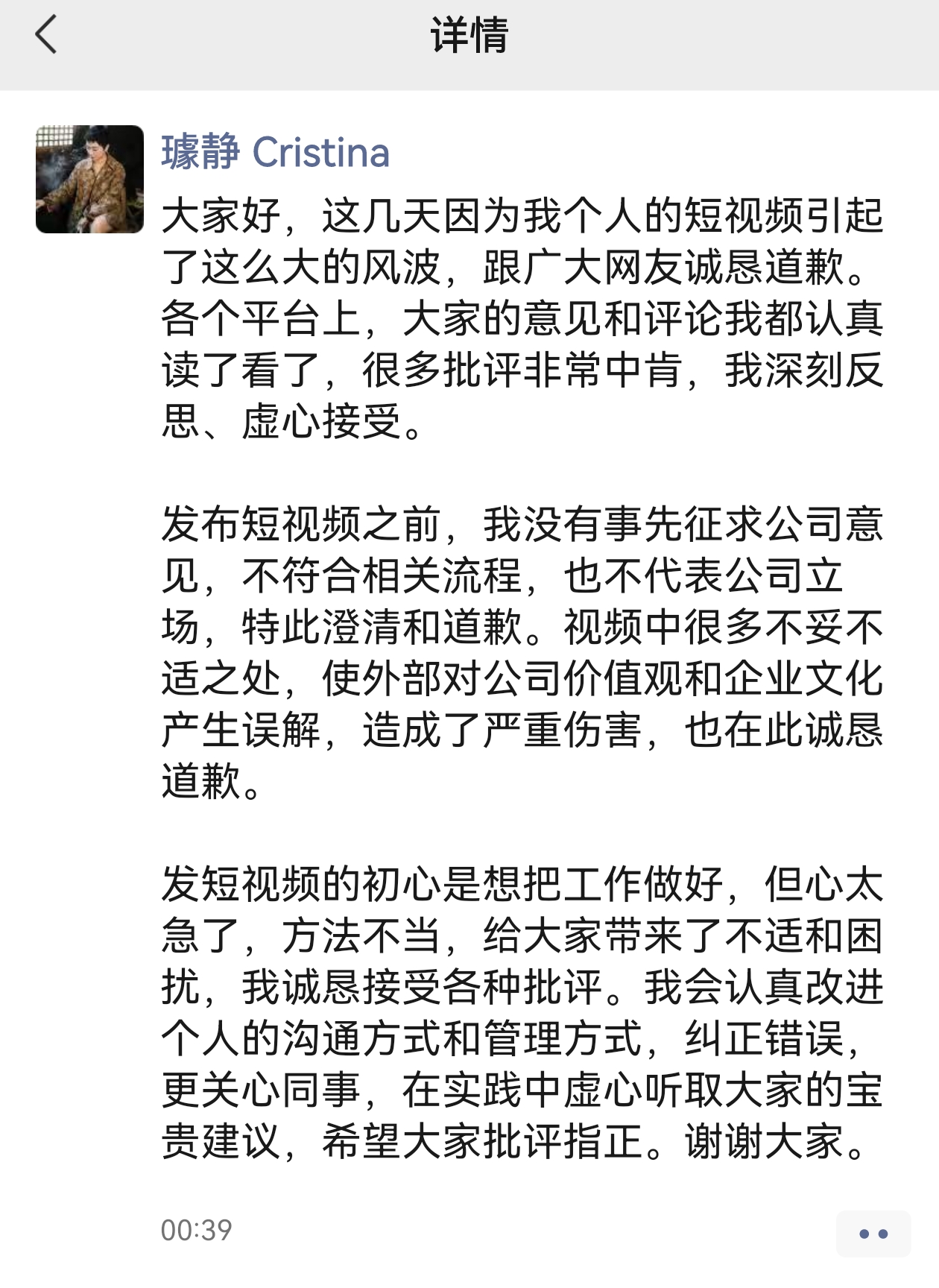 璩静表示,“发布短视频之前,我没有事先征求公司意见,不符合相关流程,也不代表公司立场,特此澄清和道歉。视频中很多不妥不适之处,使外部对公司价值观和企业文化产生误解,造成了严重伤害,也在此诚恳道歉。”