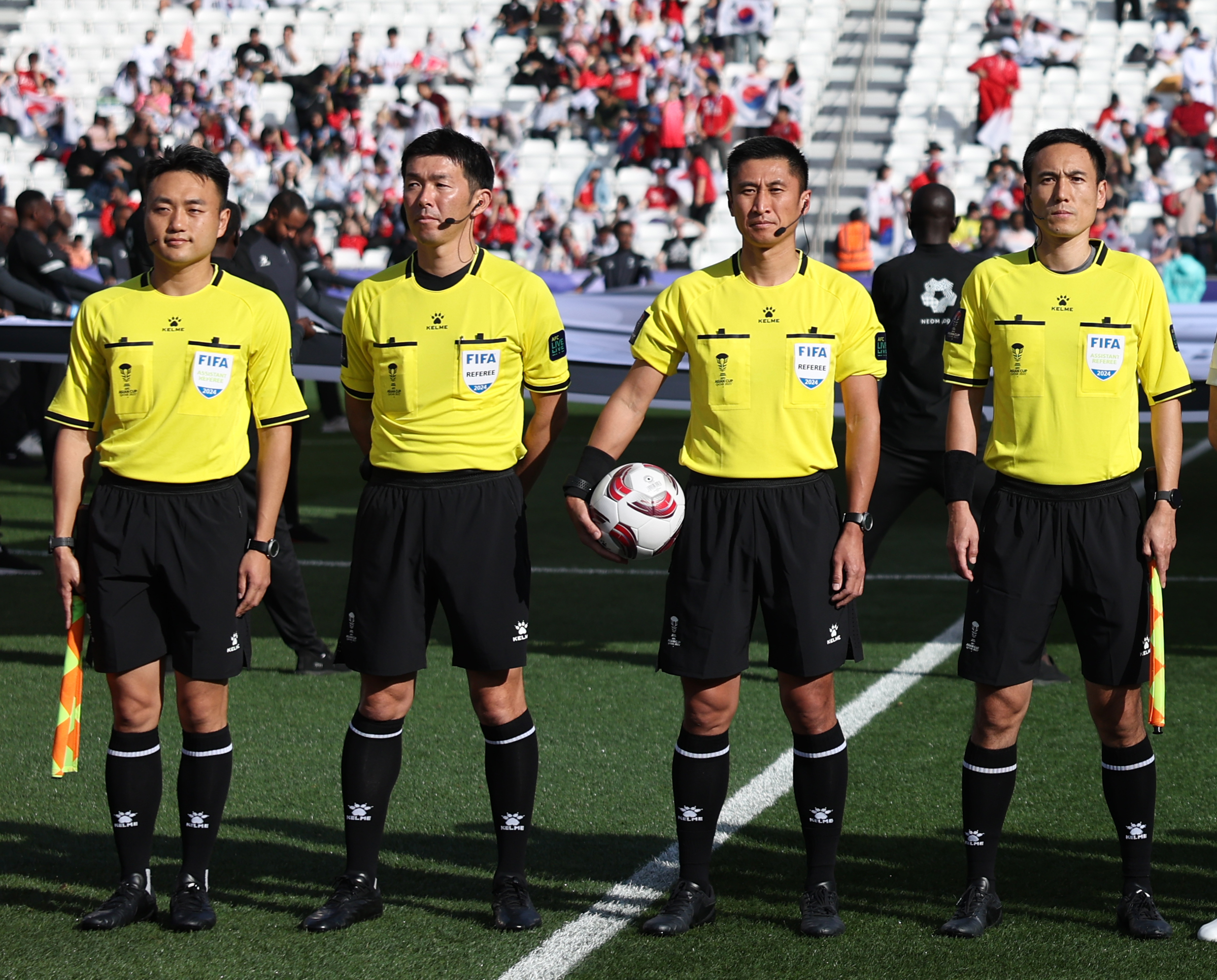 1月15日,在本届亚洲杯小组赛阶段韩国队对阵巴林队的比赛前,主裁判马宁(右二)、助理裁判张铖(左一)与周飞(右一)、第四官员荒木友辅在场地中。新华社记者 贾浩成 摄
