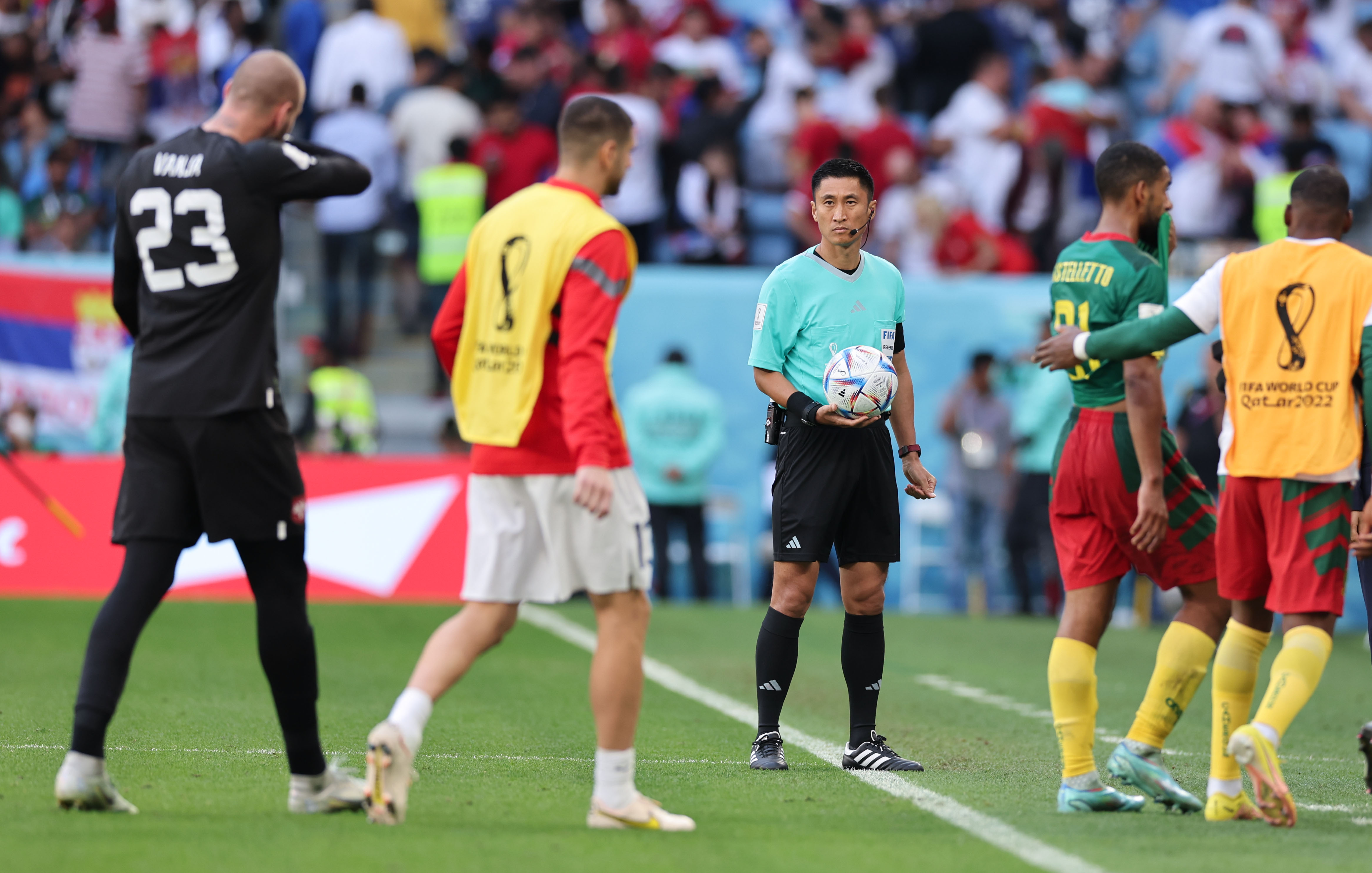 2022年11月28日,卡塔尔世界杯小组赛阶段喀麦隆队对阵塞尔维亚队的比赛中,担任第四官员的马宁(中)在上半场比赛结束时。新华社记者 徐子鉴 摄