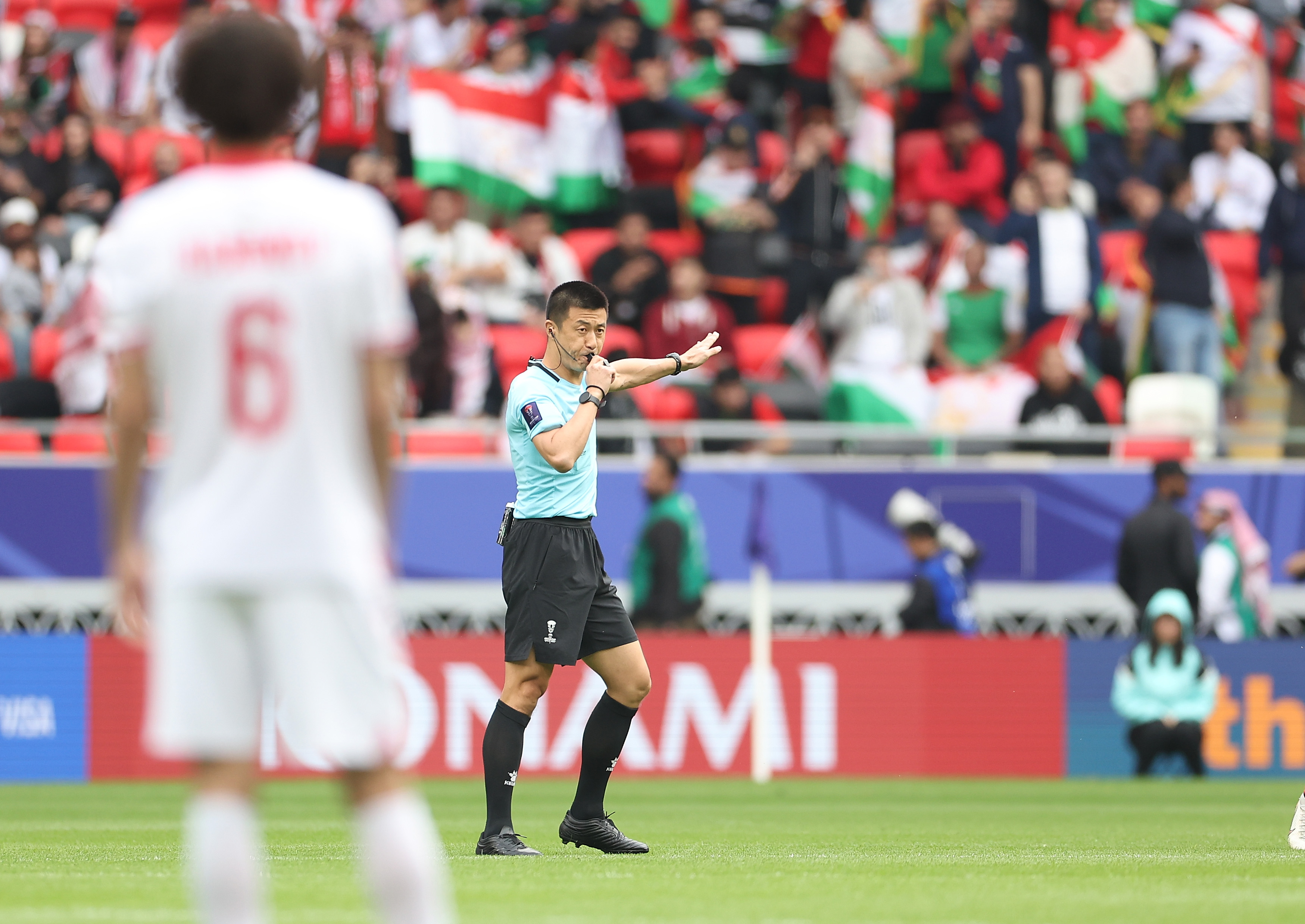 2月2日,本届亚洲杯四分之一决赛塔吉克斯坦队与约旦队的比赛中,主裁判傅明正在执裁。新华社记者 曹灿 摄