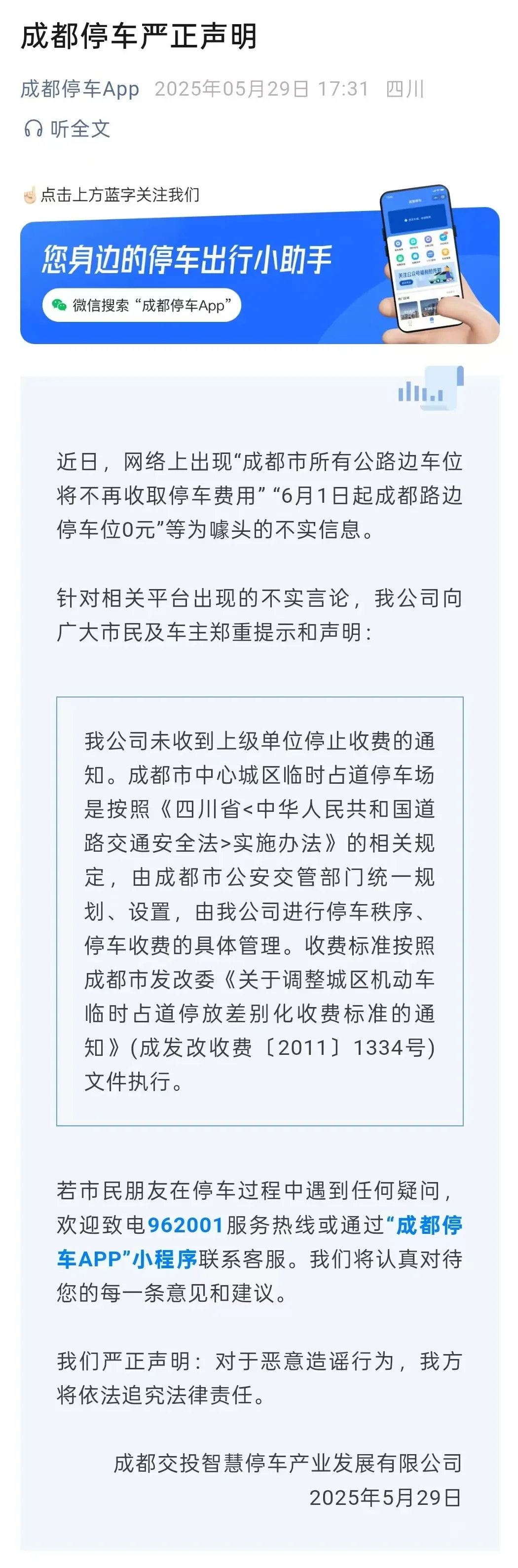 5月29日,成都交投智慧停车产业发展有限公司通过微信公众号“成都停车APP”发布严正声明,称网传“成都市所有公路边车位将不再收取停车费用”“6月1日起成都路边停车位0元”系不实信息。公司未收到上级单位停止收费的通知。