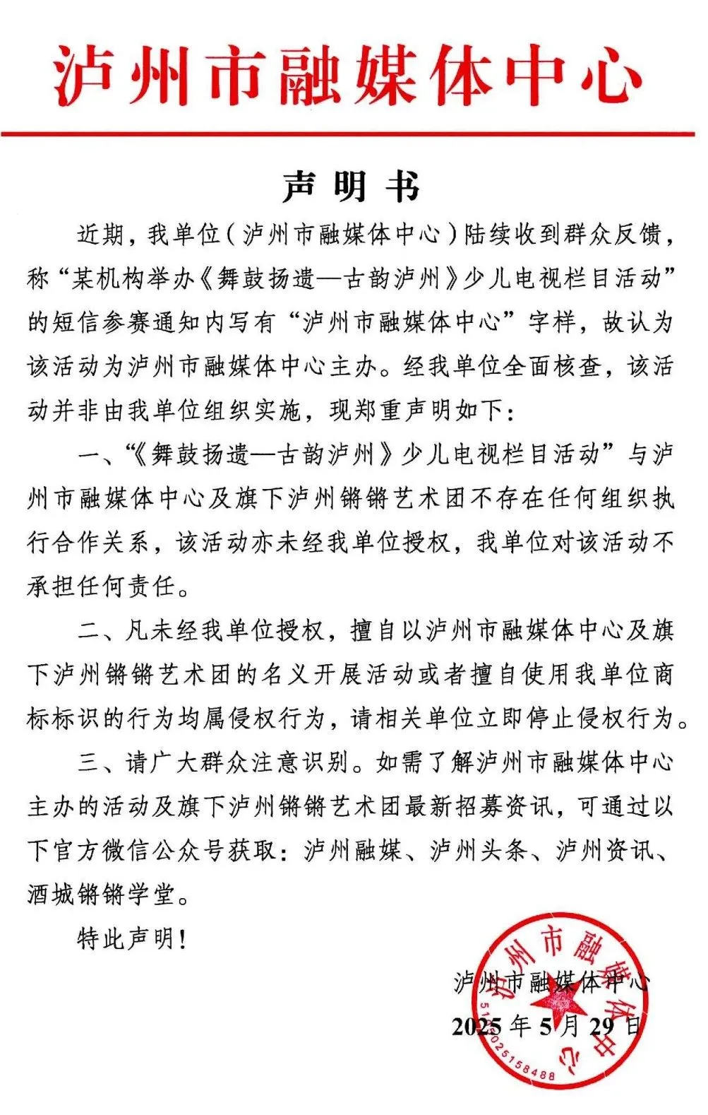 详情:近期,泸州市融媒体中心陆续收到市民反馈,称“某机构举办《舞鼓扬遗-古韵泸州》少儿电视栏目活动的短信参赛通知内写有“泸州市融媒体中心”字样,故认为该活动为泸州市融媒体中心主办。经单位全面核查,该活动并非由泸州市融媒体中心单位组织实施。