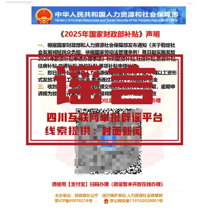 日前,有四川网民反映,通过短信等各种渠道收到所谓《2025年国家财政部补贴》声明。