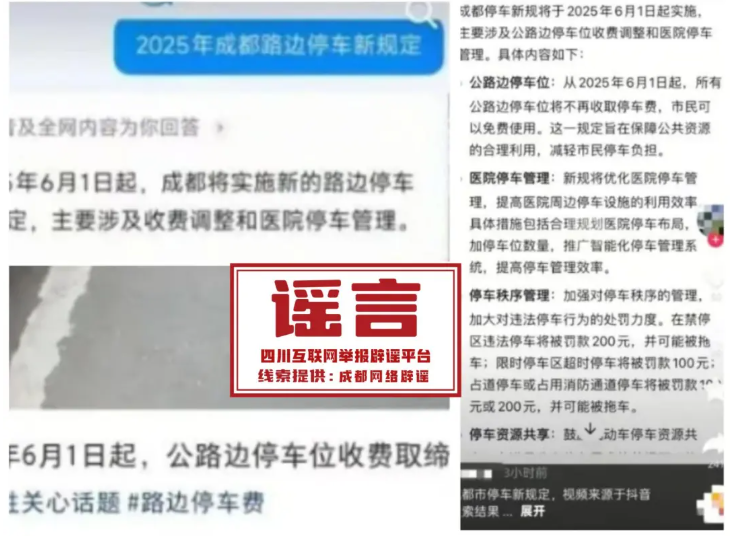 近日,个别网民在网络平台发布信息称,“成都市停车新规定,从2025年6月1日起,所有公路边停车位将不再收取停车费,市民可以免费使用”,引发舆论关注。