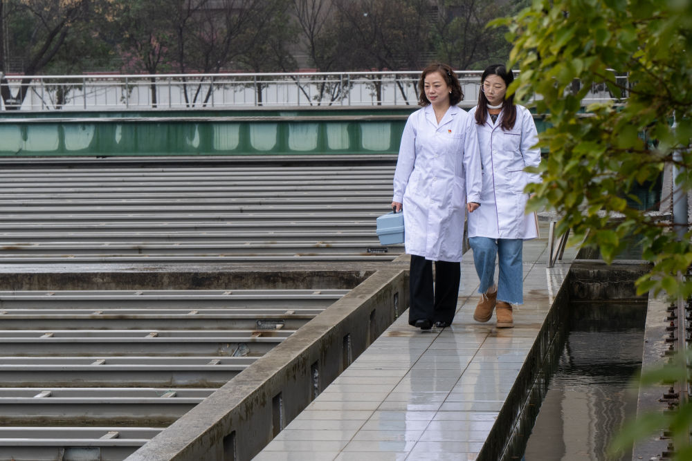 王琼(左)与同事在武汉宗关水厂沉淀池上观察水质情况(2月20日摄)。