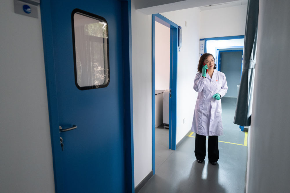 王琼在武汉宗关水厂化验室打电话联络工作(2月20日摄)。