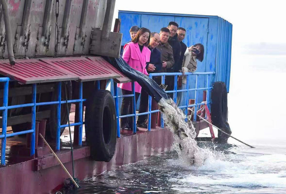 王琼(左一)与来自武汉市农业农村局、武汉市禁捕办以及武汉养殖企业的相关人员一同来到位于湖北省石首市的天鹅洲白鱀豚国家级自然保护区,为长江江豚送来“过冬口粮”(2023年12月28日摄)。新华社发(刘斌 摄)