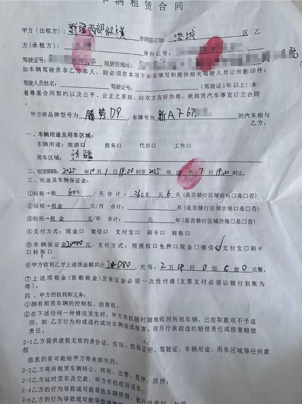 10月1日,王先生一家在塔城千泉机场落地后取车。交车时,罗某称,王先生预定的那辆豪华版商务车刚被追尾,现在提供的是一辆顶配商务车,押金需增加5000元。随后,罗某拿出空白合同给王先生填写后收走,称回去签字盖章后会反馈。但截至19日,王先生没收到合同。